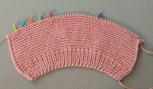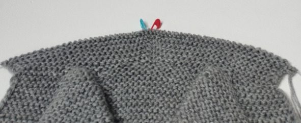 17 петель – синий маркер – 18 петель – красный маркер – 17 петель. Разделим наше вязание на три части. Петли до синего маркера – правая часть, петли до красного маркера – средняя часть, после красного маркера – левая часть.