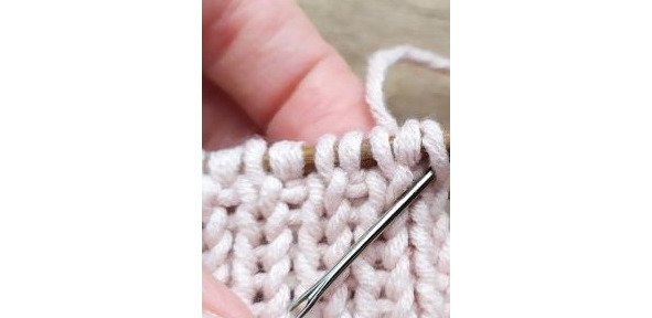 Далее сделаем эластичное закрытие петель при помощи иглы. Отрезаем нить в три раза длиннее, чем длина резинки капюшона, вставляем нить в иглу.