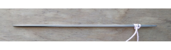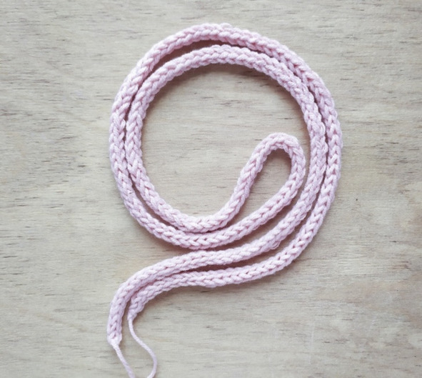 Осталось связать шнурочек из трех лицевых петель длиной примерно 1 м. Набираем на спицы 3 петли и вяжем каждый ряд – 3 лицевых, перетаскивая петли с одного конца спицы на другой.
