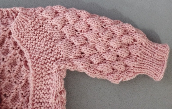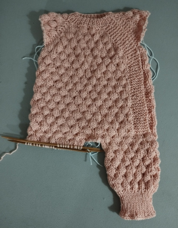 1 ряд: набираем 6 петель по краю спинки, вяжем 29 лицевых рукава и набираем 3 петли по краю переда (6+29+3= 38 петель)