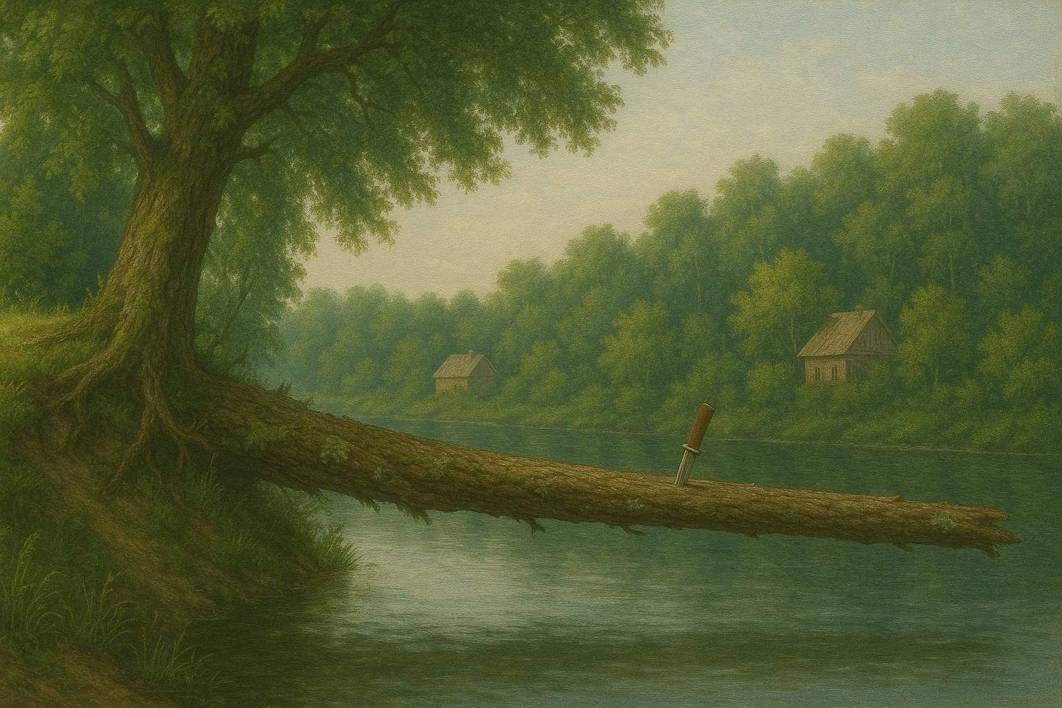 Поваленный ствол покачивался, норовя свалиться в воду, когда ребятня ходила по нему, что и задало правила местного соревнования. Самые рисковые должны были пройти по скользкому и гладкому дереву, которое опасно наклонялось над водой. Фиксировать результат надо было ножиком, который «любезно» стащили из дома, воткнув его когда-то давно «на старте». Проигравшим считался тот, кто не удержался на дереве и упал в воду. Победитель должен был нацарапать первую букву своего имени и воткнуть рядом нож.