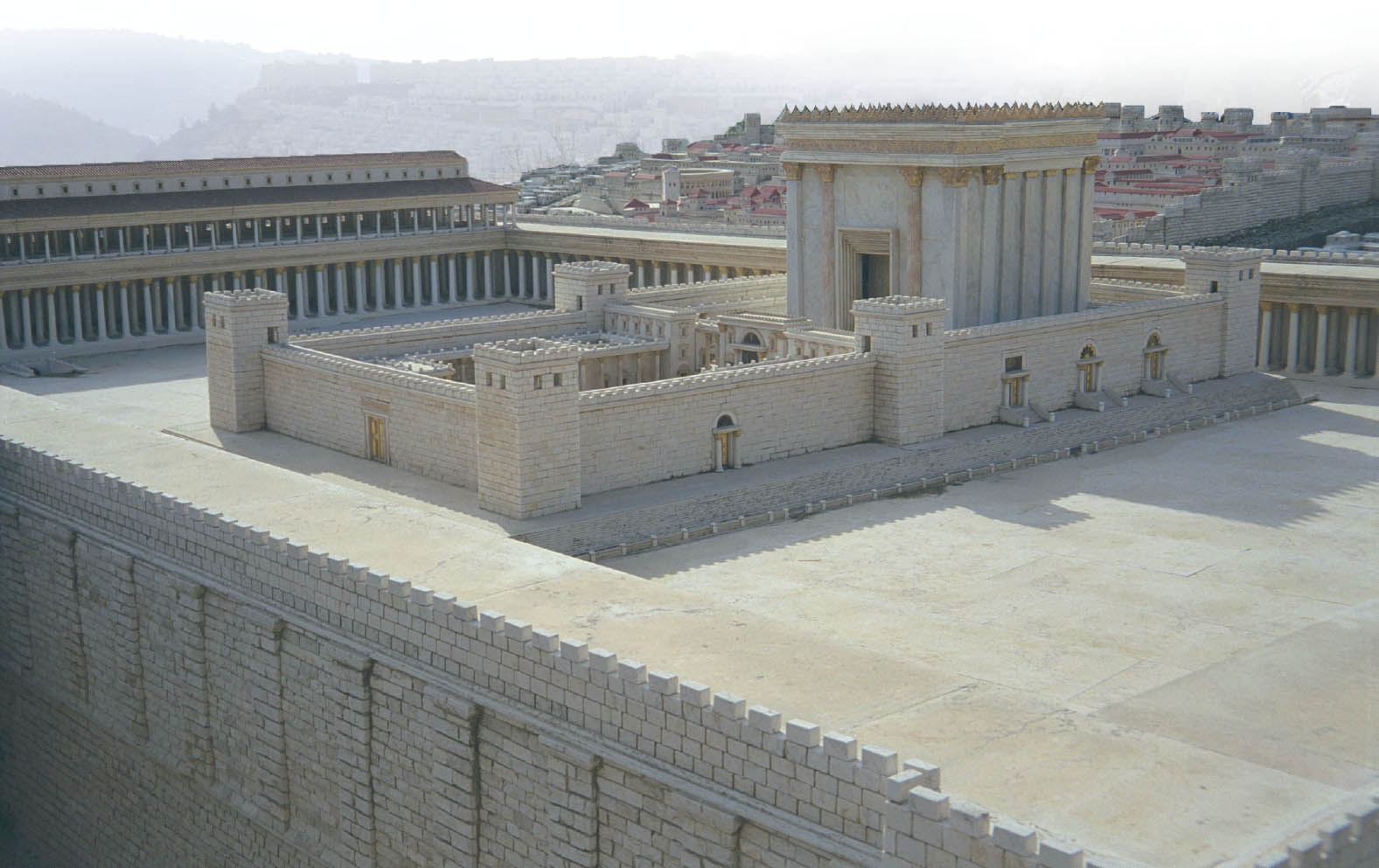 Figura 2.2. El templo de Jerusalén. El templo era el centro de adoración y vida religiosa del pueblo judío. Este modelo exhibe el edificio y sus patios externos como se veían en la época de Jesús. La plaza externa estaba abierta para toda la gente, pero al complejo amurallado en el centro de la plaza solamente los judíos podían entrar. El edificio alto en el centro es la parte interior del santuario, o «lugar santísimo», al que podían entrar solamente los sacerdotes designados en ocasiones concretas. (Craig Koester)