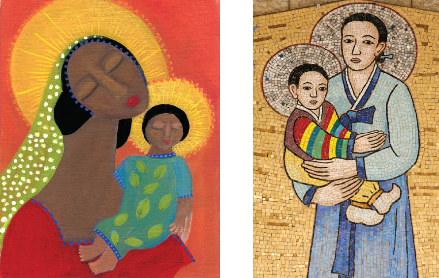 Figura 4.2. El Jesús universal. A lo largo de la historia, la gente de distintas culturas frecuentemente ha concebido a Jesús (y a veces a la Virgen María) desde el punto de vista apropiado a su contexto particular. No han tratado de representar a María y a Jesús como «realmente eran» en la Palestina del siglo I, sino como pueden parecerles a los devotos a través de los ojos de la fe. Cp. fig. 4.3. (izquierda, Rose Walton; derecha, Bridgeman Images)