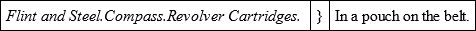 Belt.– Brown leather, with rings or dees to hang things on. These include —