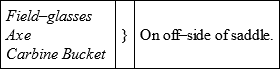 Bridle.– Ordinary military head–collar with a “9th Lancer” or “Pelham” bit, and a “reim” (thong) for tying up or knee–haltering the horse.