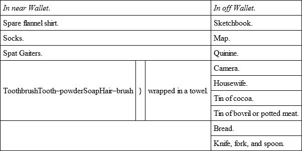 I. On yourselfHat.– A “cowboy” broad–brimmed felt hat with ventilating holes punched in the crown, and a brown silk puggree. The hat is better than a helmet, because it shades the whole of the face, and so prevents the awful infliction, veldt sores on the face, cracked lips, and burned nose; and it protects the nape of the neck and temples from the sun; can be slept in, and suffers no damage from rough usage, and does not interfere with the aim when shooting; it is light, and so does not cause weariness or headache as the helmet often does; it protects the face and ears better than the helmet does in going through thick bush, the brim turning down with the pressure of the branches.