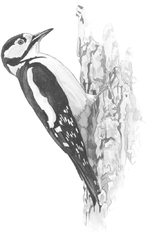 20th The great spotted woodpecker is drumming on dead wood now, beating a rapid-fire tattoo that resonates across a wide area. The full-bodied reverberations, lasting just one or two seconds, announce his territorial rights over the region. Despite the ‘great’ appellation, this woodpecker is a relatively small bird: about the same length as a blackbird and a little slimmer. It is strongly marked in black and white with a red rear; males have an obvious red patch on the nape of the neck. The species has recently colonised Ireland from Britain, breeding in County Down in 2006 and in County Wicklow in 2008. It is still rare, but its range is spreading along the east coast, where individuals sometimes visit bird feeders close to woodland or forestry. Great spotted woodpeckers have tiny pockets of air behind their bills and strengthened bone tissues that prevent them suffering brain damage from drumming.