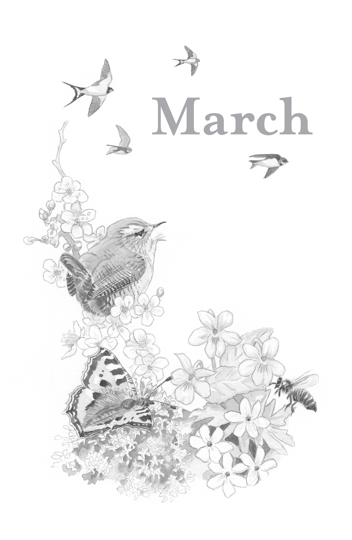 17th Ivy plants are laden with round fruits that ripen from olive green to black. The leaves surrounding the berries are a simpler, more ovate shape than the angular and lobed leaf that we usually associate with ivy. The classic ivy leaf is found only on juvenile plants, the form that the species takes when it is clothing the ground or snaking up a wall or tree. When it reaches the top of the support, where there is more sunlight, the plant enters adulthood and is ready to reproduce. Its stems change to become thicker and self-supporting, the leaves take on a more oval profile and flowers begin to form. The berries are a nutritious food in this lean month. They are popular with many birds. The least elegant are the wood pigeons, who clumsily flap and tumble while gorging. Smaller, more delicate birds, such as blue tits, goldcrests and wrens, also bustle about in the ivy, searching deftly for the overwintering insects, eggs, larvae and spiders that are hidden there.