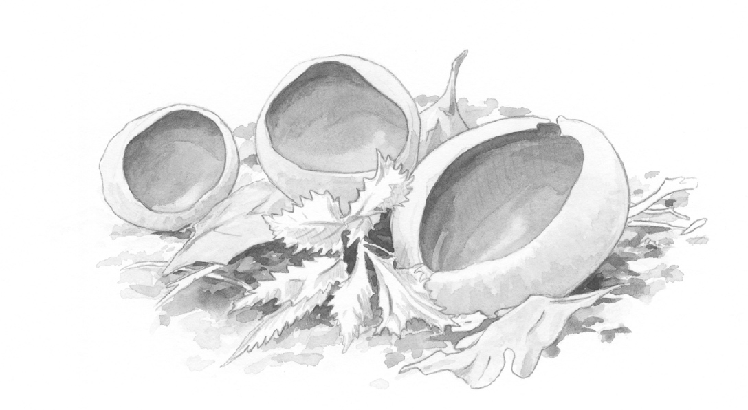 13th Although we may associate fungi with late summer and autumn, there are a few mushrooms that fruit in this season. The prettiest is the scarlet elf cup, a species that inhabits damp, broadleaf woodlands. It is so radiantly coloured and perfectly named that it might have stepped out of a children’s book. It bears wide-mouthed goblets with smooth interiors of bright orange or red and with paler outsides that look as if they are coated in felt. The showy pigmentation and generous size (up to seven centimetres across) make scarlet elf cups easy to spot. Sarcoscypha austriaca grows on fallen, decomposing sticks, including alder, beech, cherry, hazel, willow and sycamore. It is usually found pushing through vibrantly green moss, making for a cheery colour combination. Appropriately, one of its other common names is moss cups. The concave surface and warm colouring of the cups help to concentrate the sun’s rays in this chilly season, thus allowing the spores to ripen and disperse. The genus name comes from the Greek words sarco meaning flesh, and skyphos, a drinking vessel. The ruby elf cup (S. coccinea) is nearly identical: a positive identification of either species needs a microscope.