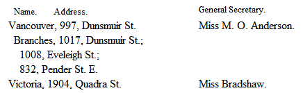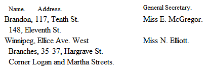 Salvation Army Hostels for Women-Immigrants.—Cathcart Lodge, 24, Cathcart Street, Montreal; Rosedale Lodge, 916, Yonge Street, Toronto; Balmoral Lodge, Mountain Avenue, Winnipeg; and Pleasant Lodge, 75, Seventh Avenue East, Vancouver.