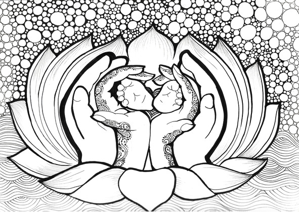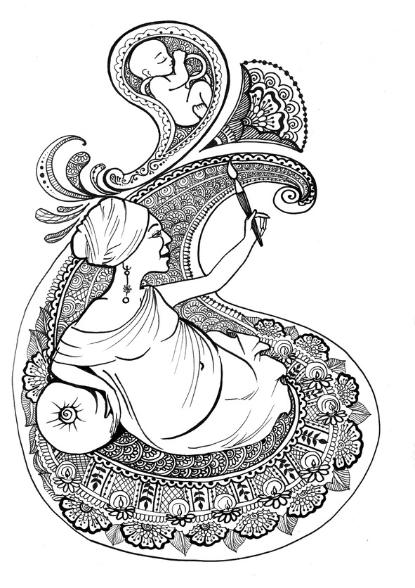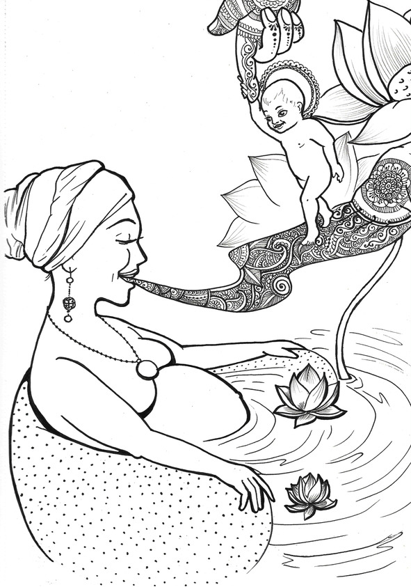 Тёмный уголок я организовала для себя ещё две недели назад. Опишу, что в нём было. Второй этаж дома, спальня, тёмные занавески, надувной бассейн, кристаллы (аметист, горный хрусталь) для структурирования воды, сакральная геометрия от моего учителя (женщина, открывающая путь «Divine Child» («Божественный Ребёнок»), я обязательно оставлю символы в приложении и опишу, как с ними работать), поющие чаши (надо сказать, всю беременность я на них играла и пела мантры нашей малышке), мягкое место на полу из нескольких одеял, и сверху я положила белое покрывало с символом Рейки, которое я специально заказывала для этого. Вокруг горели свечи, благовония, я жгла дерево Пауло Санто, очищая пространство. По кругу были разложены символы сакральной геометрии, краски, карандаши, кисти для арт-терапии, о которой я тоже тебе поведаю, аура-сома (жидкие кристаллы), а также у меня были карты АураСома таро с изображениями Архангелов. О музыке я тоже позаботилась заранее, одна из любимых композиций – это христианский хор, исполняющий композицию «Богородица, Дева, Радуйся» (очень рекомендую). Буквально за три дня до родов я сделала распечатки Богов и Богинь, отвечающих за благоприятное рождение, так как я не принадлежу ни к одной конфессии и считаю, что Бог проявляется через всё с разными энергиями. Я пригласила Его проявиться через Ганеша (индийский ПолуБог, устраняющий препятствия, сын Шивы), Кришну (Бог любви и красоты), Мать Богородицу (по понятным причинам), Макошь (Славянская Богиня Плодородия), и Иисуса (для меня это символ присутствия Безусловной Любви). Распечатанные образы я заламинировала и развесила по всей комнате. Получилось очень красиво, уютно и мистично – как я люблю.