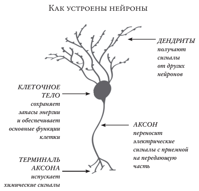 Обе нервные системы – это машины по выявлению информации, созданные, чтобы собирать данные об организме и его окружении и на их основе принимать оптимальное решение, что делать дальше[40]. Для этого они часто применяют одни и те же механизмы. Базовая единица обработки информации, нейрон, – это изумительная клетка, которая ловко умеет накапливать данные о том, что происходит в окружающем ее мире. При этом она отправляет свой «краткий отчет» о положении вещей дальше по цепочке коммуникации. На принимающем конце каждого нейрона расположен пучок ответвлений – дендритов[41], которые тянутся к соседним клеткам и пытаются подслушать их версию обстановки в мире. Нейрон накапливает данные ежемоментно на основании количества и типа получаемых сигналов – и так до тех пор, пока не достигнет порога. А тогда – бабах! – он присоединяется к тесной компании сплетников и выпускает свои химические сигналы в пространство, где его подслушивают другие нейроны. Если вам хочется по-настоящему, по-олдскульному разобраться в специфическом процессе, в ходе которого химические сигналы открывают и закрывают физические каналы, которые, в свою очередь, меняют электрическое напряжение внутри нейрона[42] и заставляют открываться новые каналы, попробуйте вбить слова action potential (потенциал действия) в поисковую строку на YouTube – там много отличных анимационных роликов[43]. А пока достаточно сказать, что у C. elegans и у человека этот процесс в общем и целом проходит одинаково.