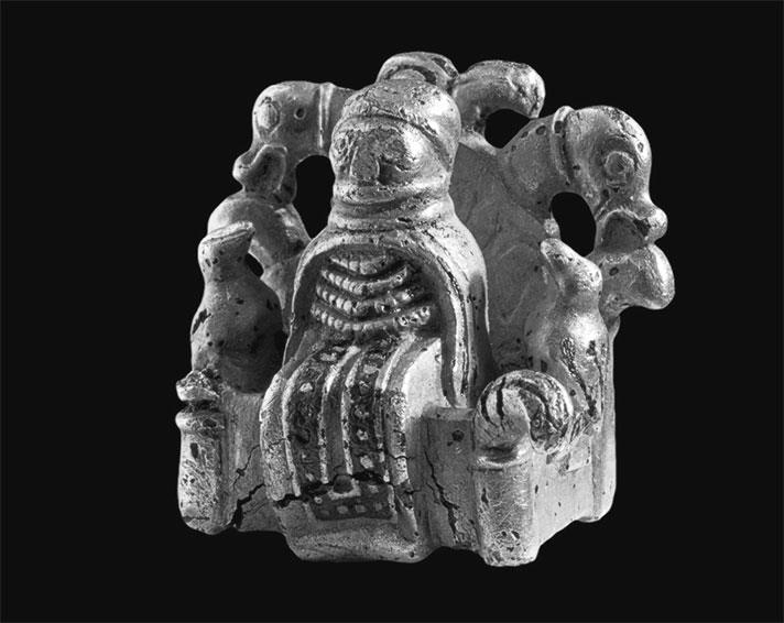 Рис. 3. Сила на троне? Крошечный литой серебряный трон с сидящей на нем фигуркой был обнаружен металлоискателем в 2009 году близ королевской резиденции Лейре в Дании. Датируется приблизительно X веком. Детали – вороны, волки и то, что фигурка имеет только один глаз (факт подтвержден микроскопическим анализом), – позволяют предположить, что это может быть Один на своем троне Хлидскьяльфе. Однако фигурка облачена в традиционную женскую одежду, что только усугубляет ее интригующую двусмысленность. Музей кораблей викингов в Роскилле. Фотография: Оле Маннинг (Ole Manning) (© Roskilde Museum)