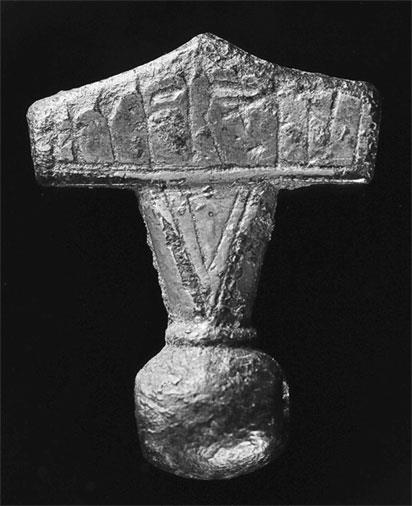 Рис. 4. Молот богов. Мьельнир, священное оружие Тора, стал символом его культа достаточно поздно, возможно, как ответ на христианский символ креста. Подвески и кольца-амулеты в виде молота Тора – одни из самых распространенных атрибутов традиционной религии. Данный образец из населенного пункта Кобелев на острове Лолланн в Дании снабжен поясняющей рунической надписью: «Это молот». Национальный музей Дании. Фотография: Джон Ли (John Lee) (© National Museum of Denmark)