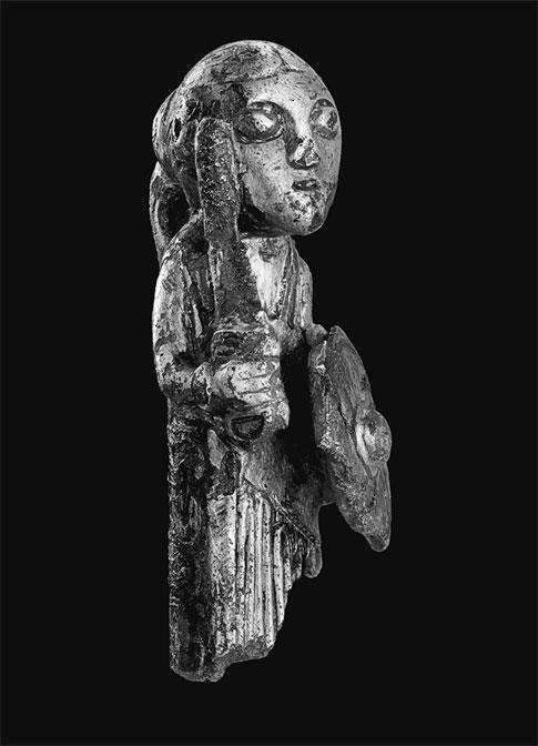 Рис. 5. Воительница. Позолоченная серебряная статуэтка X века из Харби (Дания) – первое известное нам объемное изображение вооруженной женщины из мира викингов. Не вполне ясно, кто это – валькирия, богиня войны, человеческая воительница или какое-то другое воинственное существо, но ее меч и щит выглядят вполне узнаваемо, как и характерная прическа из связанных узлами волос, по-видимому служившая основным признаком женщины в искусстве викингов. Национальный музей Дании. Фотография: Джон Ли (John Lee) (© National Museum of Denmark)