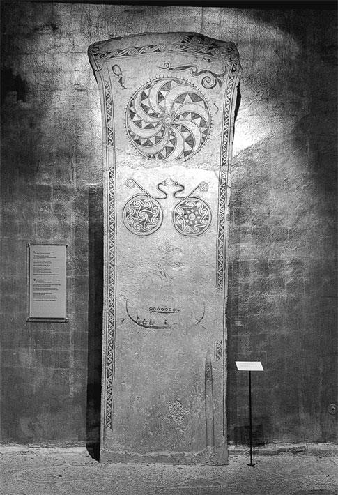 Рис. 6. Заход солнца. Поминальный картинный камень с острова Готланд, датируемый V или VI веком, с характерным изображением пылающего диска, предположительно символизирующего солнце, а также луны и звезд. В период климатического кризиса VI века, когда солнце потеряло силу, подобные изображения исчезли и больше не появлялись в искусстве Севера железного века. Этот камень из церкви Санда, его высота 3,5 метра. Музей Готланда. Фотография: Фредрик Стернер (Fredrik Sterner) (© Gotlands Museum)