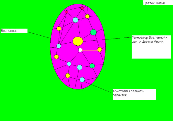 Теперь соедини все кристаллы посредством разноцветных лучей, и ты увидишь воочию Цветок Жизни. Итак, что же такое Цветок Жизни? Это – гигантский кристалл Вселенной, состоящий из триллионов кристаллов, которые исполняют роль узловых станций. Все эти кристаллы сообщаются друг с другом с помощью лучей-энергопотоков. Так формируется кристаллическая решётка. В центре Цветка Жизни расположен генератор Вселенной, сосредоточенный в одной единственной точке. Как действует генератор Вселенной, и что это такое, пока тоже останется загадкой для человечества, ибо человек ещё не готов получить такие великие знания. Ему нужно сначала очиститься от своих пороков.