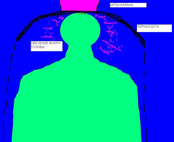 Посмотри на следующий рисунок 9, чтобы ты могла понять то, что Мы хотим сказать тебе. Ты много работаешь над собой, поэтому Мы видим свечение над твоей головой. Это ещё и потому, что ты проходила курс целительства. Обрати внимание, на тёмную дугу, которая обрамляет твою ауру сверху. Отработай «зону крови», ибо причина этой «дуги» – твои связи с родными. Они перекрывают твою Антахкарану, твою духовную связь с ангелами.