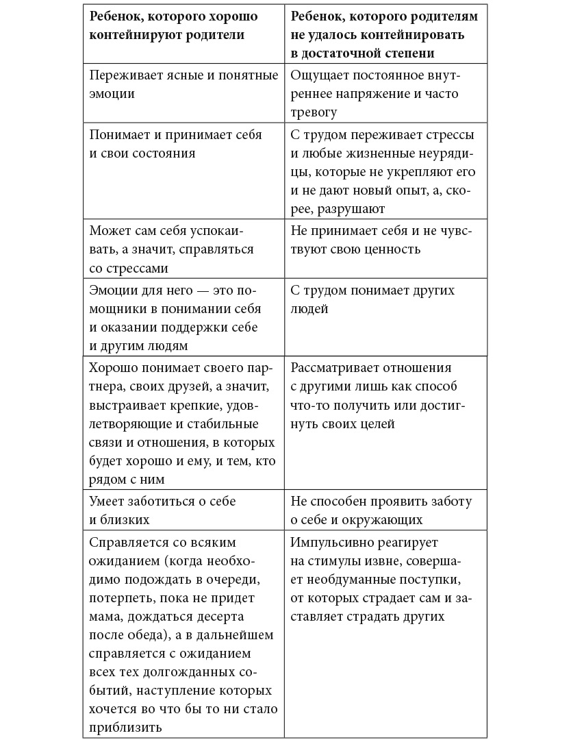 В таком случае ребенок получает следующий опыт: с его чувствами справиться нельзя, они разрушительны. При этом опыта контейнирования он не приобретает и живет с убеждением, что в нем есть нечто такое, чего нельзя вынести, что-то тяжелое, плохое и деструктивное.