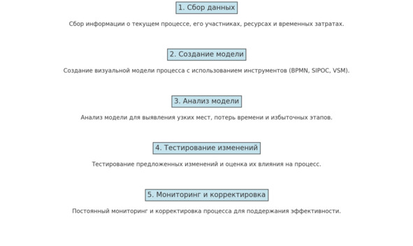 – Сбор данных: на этом этапе собирается информация о текущем процессе, его этапах, участниках, ресурсах и временных затратах.