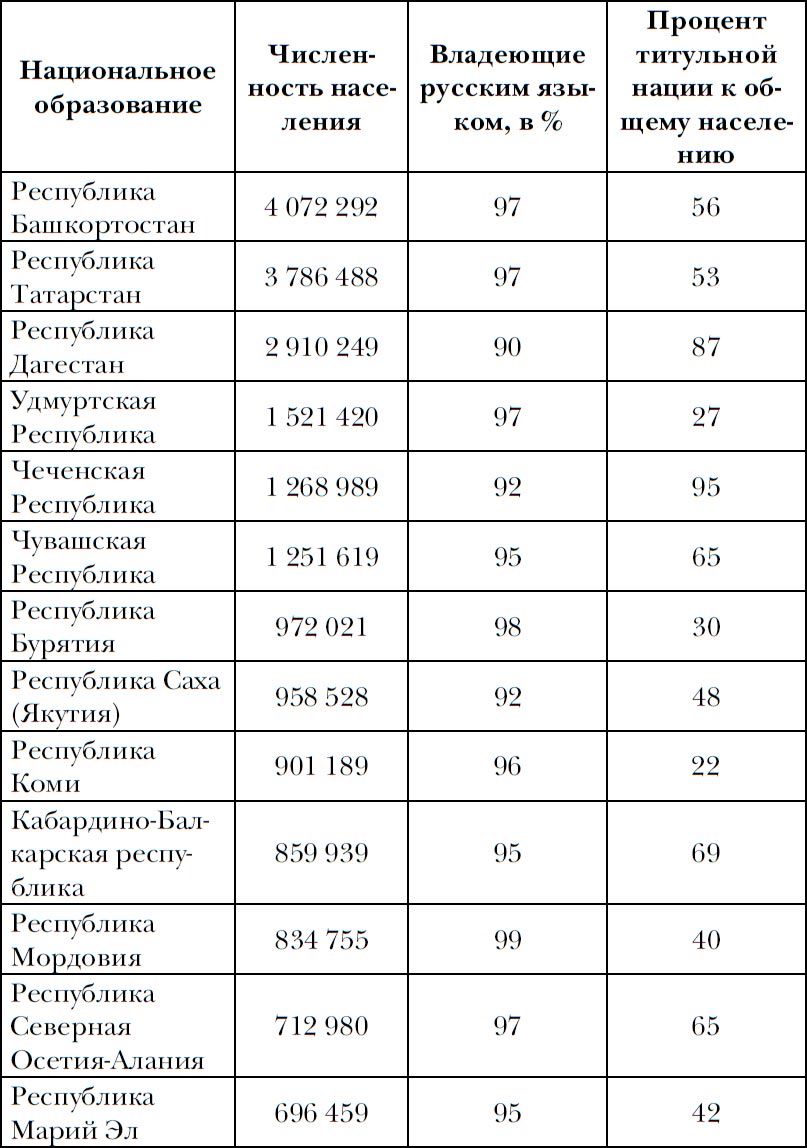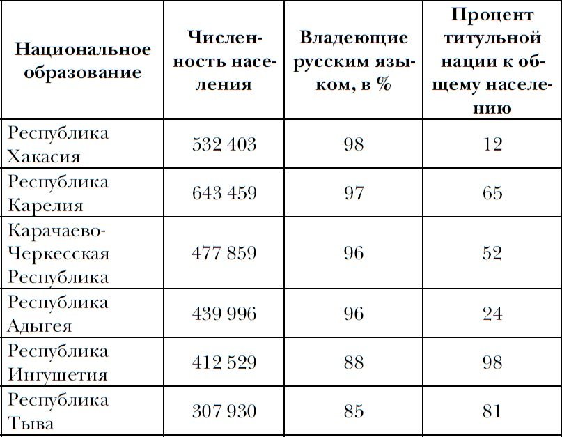 Вместе с тем чрезвычайно высок процент лиц, обладающих общегосударственным русским языком вне зависимости от их этнической принадлежности (сюда причисляются и двуязычные лица). В 17 из 21 республики Российской Федерации этот процент не ниже 95. Высок он и в Республике Дагестан – 90 %, Чеченской Республике – 92 %, Республике Саха (Якутия) – 92 %, Республике Тыва – 85 %. Очень высокий процент русскоязычного населения и в автономных округах. Этот показатель весьма важен, так как нельзя отделять друг от друга язык и культуру в ее широком смысле.