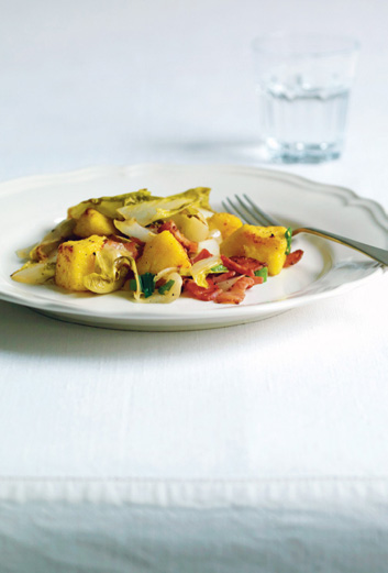 PLATE 12: Crisp smoked bacon, polenta cubes, bittersweet chicory