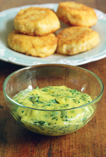 PLATE 14: Monkfish and bacon cakes; Caper and tarragon mayonnaise