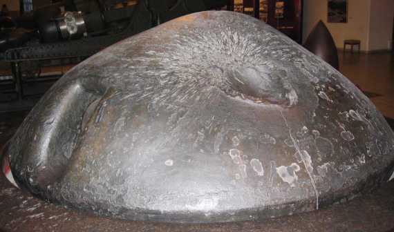 Экспонат военного музея в Вене: бронеколпак времен Первой мировой войны, снятый с австрийского оборонительного сооружения. Снаряд, попавший ближе к вершине, разорвался: об этом свидетельствуют радиальные «лучи», расходящиеся от вмятины. А вот у снаряда, вмятина от попадания которого видна левее, вероятно, отказал взрыватель