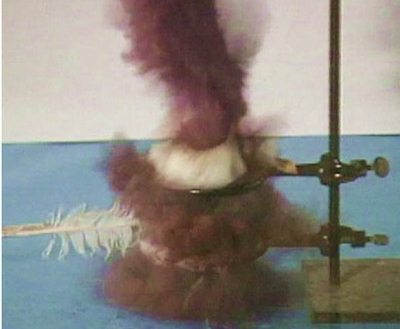 Йодистый азот – одно из самых чувствительных взрывчатых веществ. Касание нижнего образца птичьим пером привело к появлению горячих точек при переламывании длинных и хрупких кристаллов ВВ и возникновению детонации. Расположенный выше образец йодистого азота отделен от взорвавшегося значительным воздушным промежутком, но детонацию вызвала сформированная в воздухе первым взрывом ударная волна. Промышленно синтезируемые ВВ, конечно, не так чувствительны, как йодистый азот: чтобы инициировать в них детонацию, давление в ударной волне должно превышать 20 тысяч атмосфер
