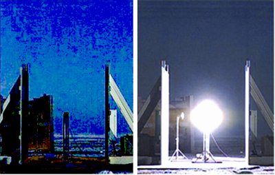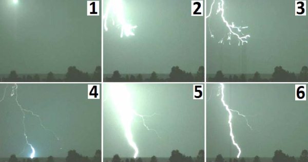 Молекулы воды – связки «положительного» водорода и «отрицательного» гидроксила (ОН). Их можно разделить механически, при соударениях, что и происходит в воздушных потоках. В грозовом облаке разделяются очень большие заряды – до тысячи кулон. Когда напряженность электрического поля между грозовым облаком и землей превышает пробивную, электроны приобретают энергию, достаточную для ионизации (это происходит вблизи облака, потому что на высоте плотность молекул ниже и электроны разгоняются дольше, приобретая большую энергию). Так формируется светящийся плазмоид – лидер (кадр 1). Носители заряда движутся по направлению поля, образуя проводящий канал и увеличивая при этом напряженность. Рост напряженности приводит к появлению и других лидеров, «разветвляющих» разряд (кадры 2–3). Там, где один из лидеров оказывается наиболее близко к земле, напряженность возрастает настолько, что происходит встречный пробой, вызванный носителями противоположного знака (кадр 4). Далее ток (сила которого может достигать миллиона ампер) протекает по сформировавшемуся плазменному каналу с температурой в десятки тысяч кельвинов, где многие атомы при высокоэнергетичных столкновениях лишились своих электронов (кадр 5). Расширение канала приводит к охлаждению плазмы, рекомбинации (воссоединение носителей электричества разных знаков) и ослаблению ее свечения (кадр 6). На снимке справа – разряд молнии, спровоцированный длинным металлическим стержнем, выступающим над грунтом. Ток протекает не только по стрежню: произошли многочисленные разряды в воздухе, образовавшие «канат». В образованной расширяющейся плазмой ударной волне температура уже недостаточна для ионизации, происходит лишь возбуждение атомов (переход их электронов на более высокие энергетические уровни). При дальнейшем охлаждении и возвращении атомов азота в основное состояние испускаются кванты «голубого цвета» (области испускающего характерное свечение воздуха отмечены стрелками). «Удар по ушам» УВ от близкого разряда молнии весьма ощутим. На других фотографиях читатель увидит и фронт УВ, но, чтобы получить такие снимки, необходимы весьма кратковременная экспозиция и специальная подсветка процесса