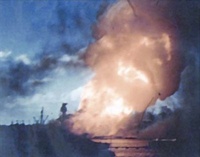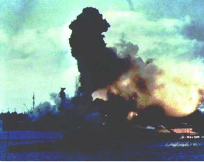 «Бомба попала в палубу у башни № 2 главного калибра, пробила полубак и, взорвавшись внутри корабля, вызвала детонацию зарядов в боевых погребах. Огромный столб огня и дыма взметнулся вверх метров на 200, принимая форму огромного гриба. Г рома взрыва почти не было. Свидетели говорят, что услышали что-то более похожее на гигантский вздох, нежели на гром. Грома не было, но ударная волна была ужасной. Она заглушила мотор на пикапе авиационного оружейника Харранда Квисдорфа, ехавшего по дороге к острову Форд[11].»