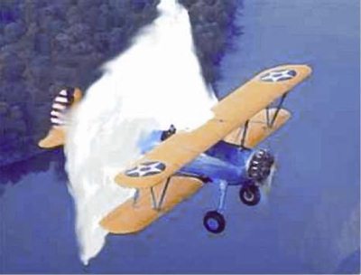Сформируется ли УВ и если да, то как близко к движущемуся телу, зависит от скорости тела и от того, насколько сжимаемому воздуху позволено «растекаться», сбрасывая избыточное давление. Летящий с небольшой скоростью биплан (рис. 1.20) воздух перед собой, конечно, слегка уплотняет, но не формирует ударную волну с резким скачком плотности, который было бы видно на носу машины. Другое дело – пороховые газы, вырвавшиеся из «Аризоны»: они расширялись во всех направлениях, так что сжатому на их фронте воздуху просто некуда было деваться – ему оставалось двигаться по нормали к фронту, поджимая все новые слои. Да и то, по нашим оценкам, такое течение привело к формированию УВ за тысячи метров от взрыва.