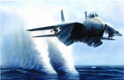 Палубный истребитель F-14 предназначен для воздушного боя на сверхзвуковых скоростях, его крылья изменяемой геометрии сложены, а двигатели работают так, что там, где газы их выхлопа достигают моря, вздымаются огромные столбы воды. Но и он пока не преодолел звуковой барьер – иначе воздух не успевал бы расступиться перед истребителем и сжимался бы им в область конической формы, со значительной плотностью и резкой границей. Такой «конус» стал бы видимым и «сел» бы на носовую часть самолета – так, как это случилось с летящей со сверхзвуковой скоростью пулей (слева внизу).