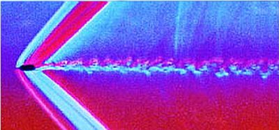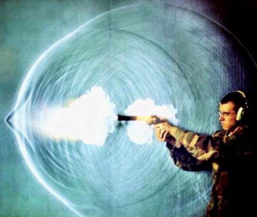 Из-за скачка плотности воздуха, ударную волну можно, увидеть, так как с увеличением плотности растет и показатель преломления, что вызывает смещение лучей света. Скачок уплотнения выглядит, как чередующиеся полосы большей и меньшей освещенности. Снимок пули сделан в 70-е годы XX века, а методы теневой съемки были детально разработаны германскими учеными в годы Второй мировой войны. Из теории ударных волн следует, что образуются они не только в носовой части летящего тела, но и на его оконечности. Мы слышим двойной хлопок головной и хвостовой ударных волн от пролетевшего со сверхзвуковой скоростью самолета, потому что его длина достаточно велика и волны возможно различить. Ударных волн от летящей пули – тоже две (одна «сидит» на головной части, другая образуется за хвостовой), но размеры пули на три порядка меньше, чем самолета, и наш орган слуха их не различает