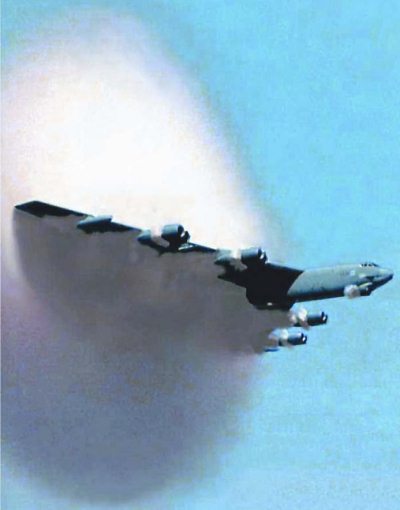 Конструкция и тяга двигателей стратегического бомбардировщика В-52 не позволяют и ему достичь сверхзвуковой скорости, хотя летит он, конечно, быстрее биплана и зоны конденсации образуются за каждой выступающей деталью (справа).