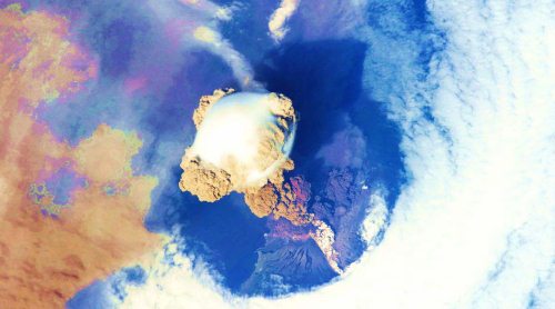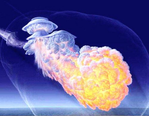 Ударные волны возникают не только благодаря деятельности человека. Вверху: компьютерная реконструкция Тунгусской катастрофы, произошедшей над сибирской тайгой в 1908 г. Метеорит (точнее – метеороид) представлял собой ядро неплотного льда весом порядка миллиона тонн. В правой верхней части рисунка видно, что еще при полете ядра в сравнительно разреженном воздухе образовалась УВ (конус ее справа вверху). При входе в более плотную атмосферу, выделение тепла стало столь интенсивным, что метеороид взорвался, сформировав более мощную и иной формы УВ, которая свалила и сожгла лес на площади более 2000 кв. км. Размеры «бурелома» позволили спустя полвека оценить энерговыделение процесса: оно оказалось таким же, как и при взрыве 20 миллионов тонн тринитротолуола. Внизу: после взрывного извержения курильского вулкана Пик Сарычева, в нагретых прошедшей ударной волной облаках конденсированные частицы воды вновь превратились в прозрачный пар, благодаря чему появилось «окно», через которое из космоса и было сфотографировано явление. Известный человечеству рекорд взрывного энерговыделения, произошедшего на поверхности Земли принадлежит вулкану Кракатоа: при извержении 1883 г., он был оценен, как эквивалентный пяти миллиардам тонн тринитротолуола. В воздух при этом было выброшено около 6 кубических километров пепла, а выродившаяся в акустическую ударная волна была слышна на удалении 4800 км.