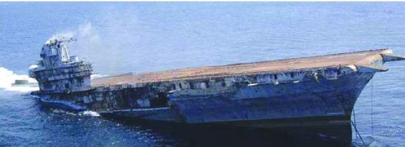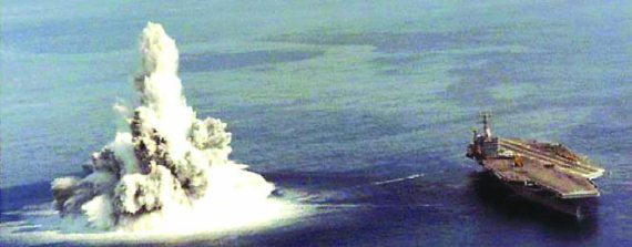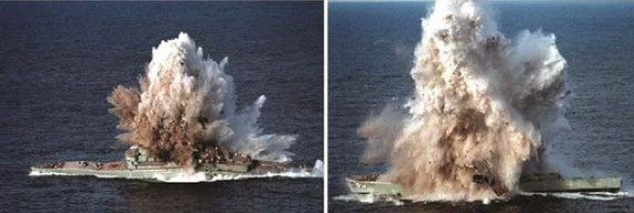 Испытания стойкости крупных кораблей к подводной ударной волне. Верхний снимок: модельный опыт воздействия ударной волны в воде на авианосец «Констеллейшн» (постройки 60-х годов). ВВ в этом опыте взорвали много (более тонны), но и расстояние до объекта значительно (для сравнения: длина авианосца – треть километра). Нижний снимок: авианосец «Орискани», построенный в годы Второй мировой войны, подобного испытания не выдержал