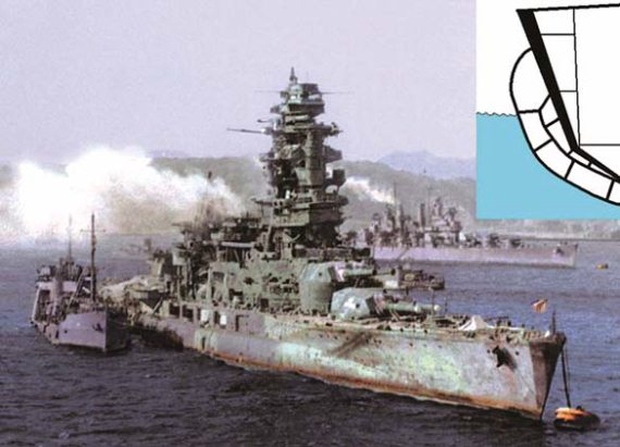 На врезке – типовая схема противоторпедной защиты линейного корабля. На фотографии – японский линкор «Нагато» постройки 1920 г., по правому борту которого виден будь такой защиты. Снимок сделан после капитуляции Японии, 12 ноября 1946 года в порту Йокосука, откуда «Нагато» направился к тихоокеанскому атоллу Бикини, не пережив там испытательного подводного взрыва американского ядерного заряда
