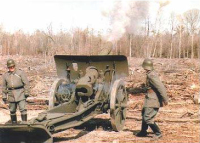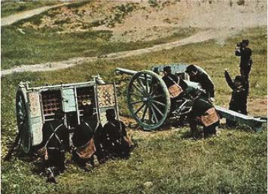 Артиллерийские орудия с внедрением бездымных порохов стали выглядеть изящнее (ср. с рис. 1.5), а главное – стрелять дальше и – поскольку были снабжены оптическими приборами (панорамами) и прецизионными механизмами наводки – точнее. Слева на верхнем снимке – выстрел германской 150 мм полевой гаубицы, ниже – французская 75 мм пушка, объективно – одна из лучших в своем классе, но для решения задач позиционной войны недостаточно могущественная. Русская армия вступила в войну, имея на вооружении в полтора раза больше трехдюймовых (76 мм) орудий, чем французская – 75 мм. Справа – артиллерийская панорама конца XIX века