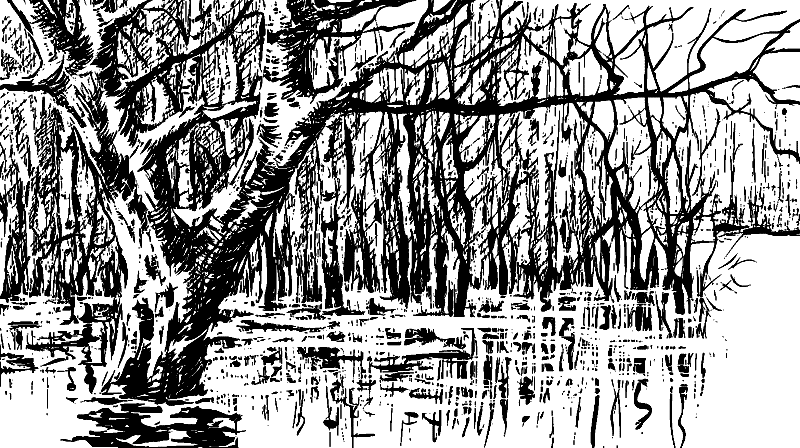 А на довольно-таки большом дереве, стоящем, наверно, под водой на высоком пригорке, сидела жадная, голодная ворона и выискивала себе добычу. Невозможно бы ей было углядеть в развилочке водяную крысу, но на волне от соприкосновения с хвостом плыли кружочки, и вот эти-то кружочки и выдали вороне местопребывание крысы. Тут началась война не на живот, а на смерть.