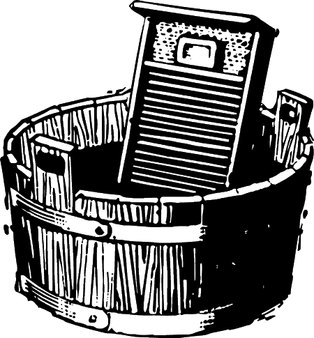 Раньше в деревнях бельё стирали так. Его замачивали в воде с золой, которая использовалась вместо мыла, потом клали на деревянную колоду и колотили специальными деревянными колотушками-валкам – «выбивали» всю грязь, потом полоскали. Всё повторялось несколько раз, пока бельё не станет чистым. Затем бельё сушили и гладили деревянными рубелем и каталкой.