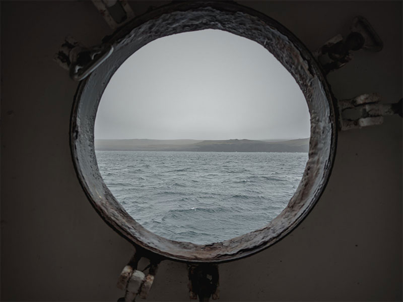 «Михаил Сомов» неспешно идет по волнам – и вдруг сквозь хмарь и низкие тучи проступает берег. Мы приникли к иллюминаторам. Суровая, пустынная земля. Берег неровный, очертания изрезанные. Встаем на якорь, и мы узнаем новые вводные. Пока груз не будет доставлен на берег, волонтеры остаются на борту.