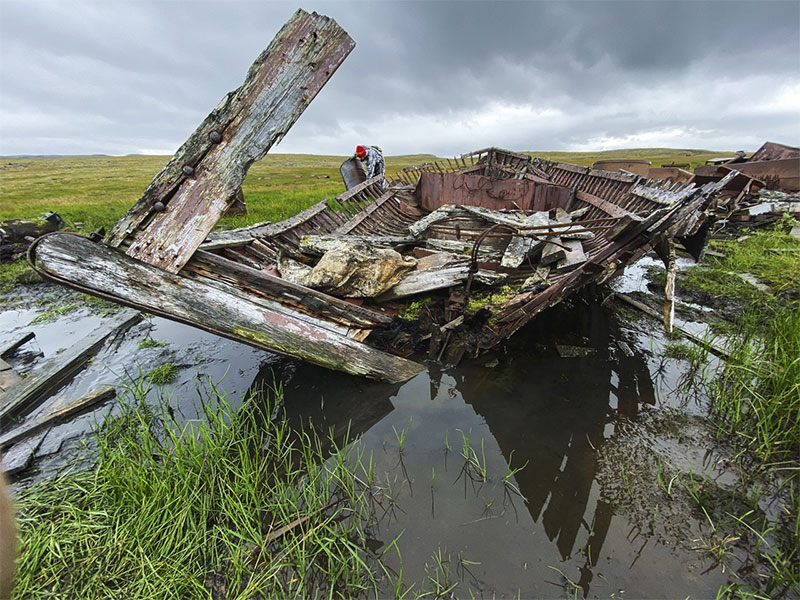 Спустились в ложбину – «поля Армагеддона», как я про себя называю локацию, выбранную для первого приложения сил. Вдоль ложбины тянется дорога, к ее обочине мы и стаскиваем металлолом. Почва заболоченная; посреди поля-болота торчит остов лодки. Обшивка бортов давно сгнила, и лишь ребра-шпангоуты вырастают из топи. Делаем предположение, что некогда здесь располагался искусственный мелководный канал к морю.