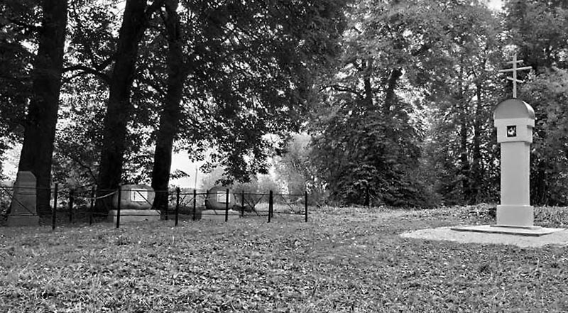 Бывшее кладбище в селе Лобково. Слева направо: памятники Каретниковым и М. К. Пржевальскому; два памятных камня; часовенка. 2018 г.