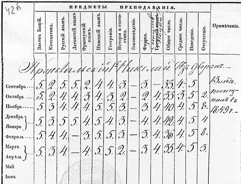 Мы сравнили аттестаты и экзаменационные списки братьев Пржевальских. Владимир имел средний балл 4,9. У него была одна четверка – по математике. Николай имел средний балл 4,6. У него было четыре четверки: по российской словесности, российской грамматике, математике, общая по рисованию, черчению и чистописанию.