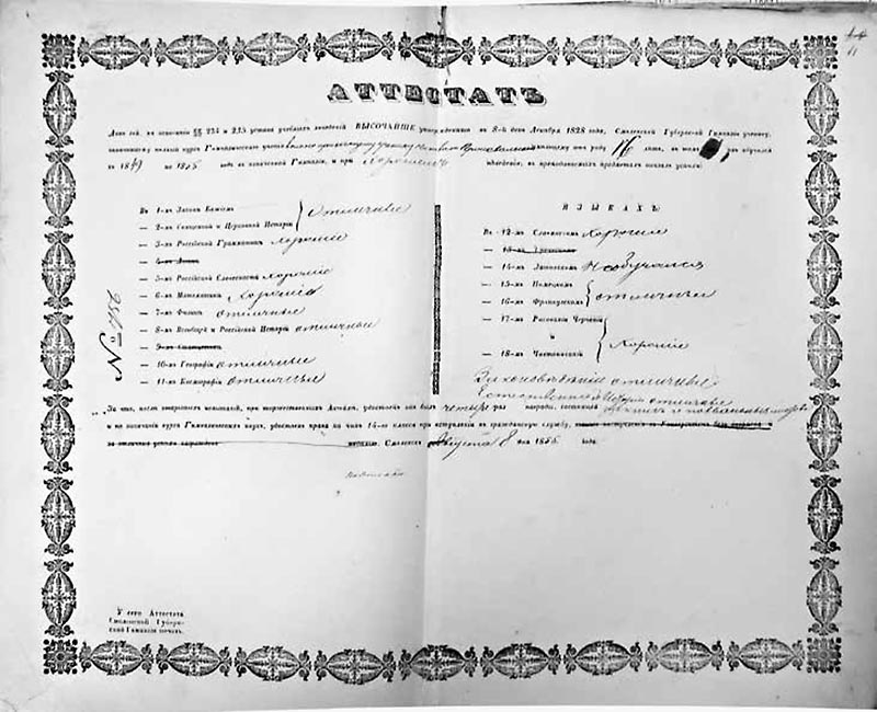 Недавно благодаря архивной работе Игоря Владимировича Шкурлова мы смогли увидеть гимназический аттестат Николая Пржевальского и ознакомиться с решениями педагогического совета Смоленской гимназии.