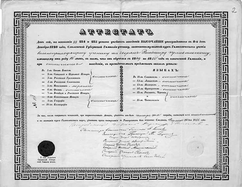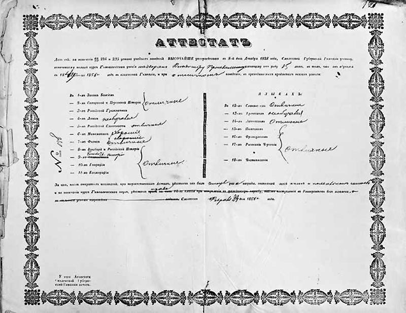 Заметим, что аттестат Владимира был выдан в феврале 1856 г., а не в августе 1855 г., как Николаю. Возможно, это была повторная выдача. Нахождение черновиков аттестатов в архиве гимназии было совершенно естественным, так как подлинники братья Пржевальские представили по месту службы и учебы.