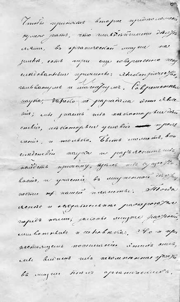 Убеждение ‹нрзб.› сомнительное, потому что человек есть то же самое животное, организм того и другого живет и действует на одних и тех же началах при одних и тех же условиях. А эти одинаковые начала и условия должны иметь и одинаковую причину жизни. Поэтому или человек и все животные имеют в себе духовное начало – причину жизни, или жизнь их есть только следствие известных отправлений организма.