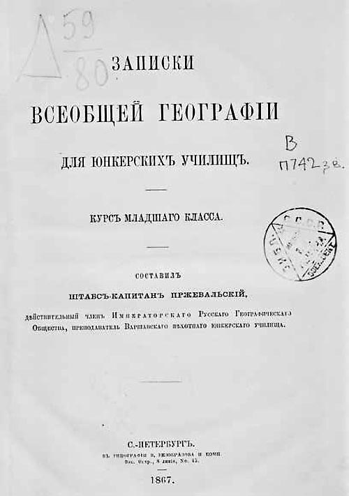 С той же целью, «пристрастить к знаниям» юнкеров, он написал учебник по географии. На обложке значилось: «Записки Всеобщей географии для юнкерских училищ. Курс младшего класса. Составил штабс-капитан Пржевальский, действительный член ИРГО, преподаватель Варшавского юнкерского училища» (СПб., 1867. 174 с.). В предисловии было сказано, что это «краткий учебник всеобщей географии приноровлен к особенному характеру преподавания этого предмета в юнкерских училищах [выделено самим Пржевальским. – Авт.].