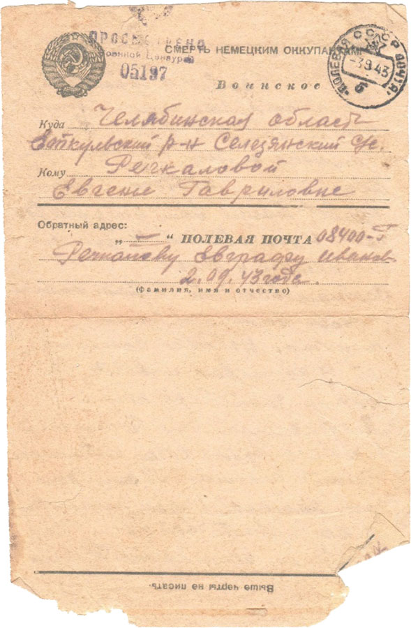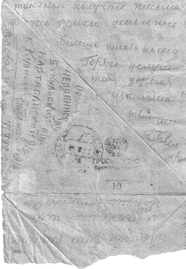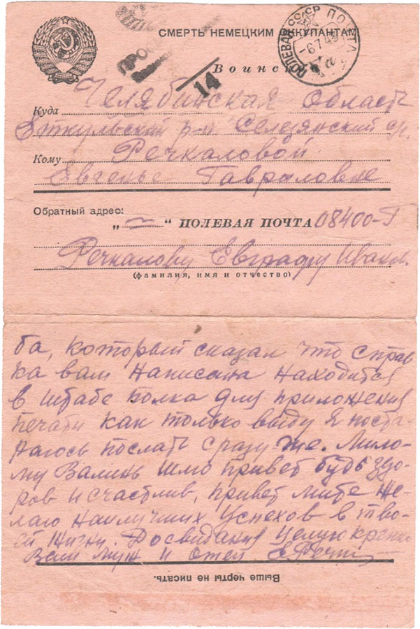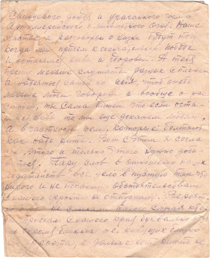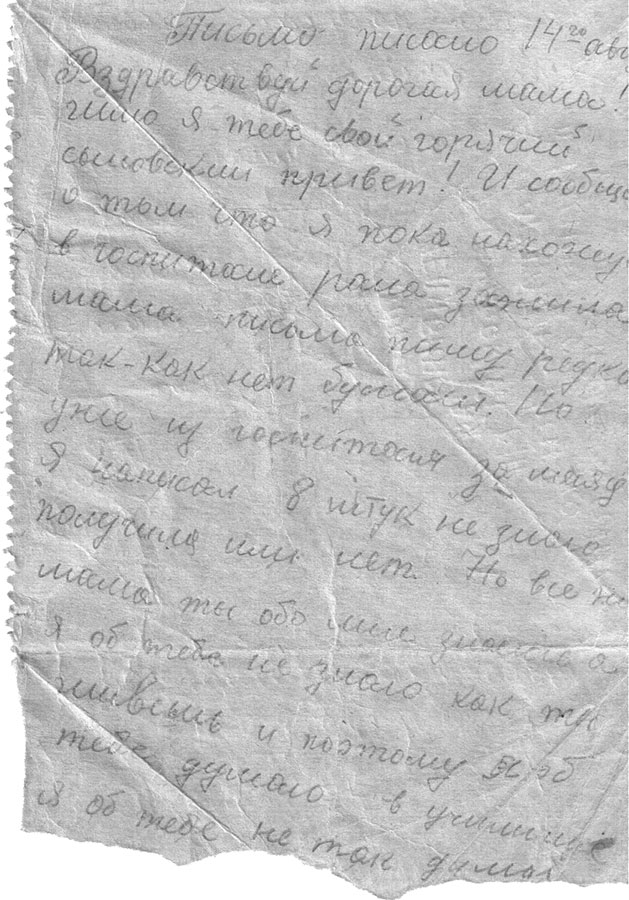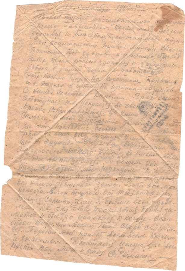Добрый день. Здравствуйте мои родные, мама, Леля, Вова,… Шлю вам свой гвардейский привет… присвоено звание за Сталинград Гвардейская… и должны скоро получить за оборону Сталинграда… мама. Живу я хорошо, еды досыта ем и табак…а мне больше ничего и… в боях я был ч[етыре?]… подряд и ни разу не был ран[ен]… находимся на отдыхе в Бор… уже как три месяца и скоро опять поедем на фронт. …только останусь живой, то приеду и кое-что, может, тогда расскажу, но не сразу едва только… но уже побывал под… огнями и все же остался жив. Мама, писать больше нечем. Жив и здоров, чего и вам желаю в вашей жизни. Мама, напи[ши], где находится почта…а то я не знаю про них, жив[ы] или нет. Мама, передал вам… с прошлым от меня мой Гвардейский привет. Не забудь передай Издергину Ва… и бабке, и тетке, как… Пущай они мне напишут письмо, как они проводят свои молодые годы… и я провожу свои молодые годы на отечественной войне… Жив и здоров. Жду ответ. Пишите… или нет. Ваш сын Сергей».